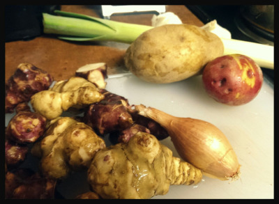 In a separate pan, heat the other olive oil and saute the onion and garlic scapes 3-5 minutes, until onions soften. Add the greens and saute until wilted, maybe 2 minutes. Remove from heat.