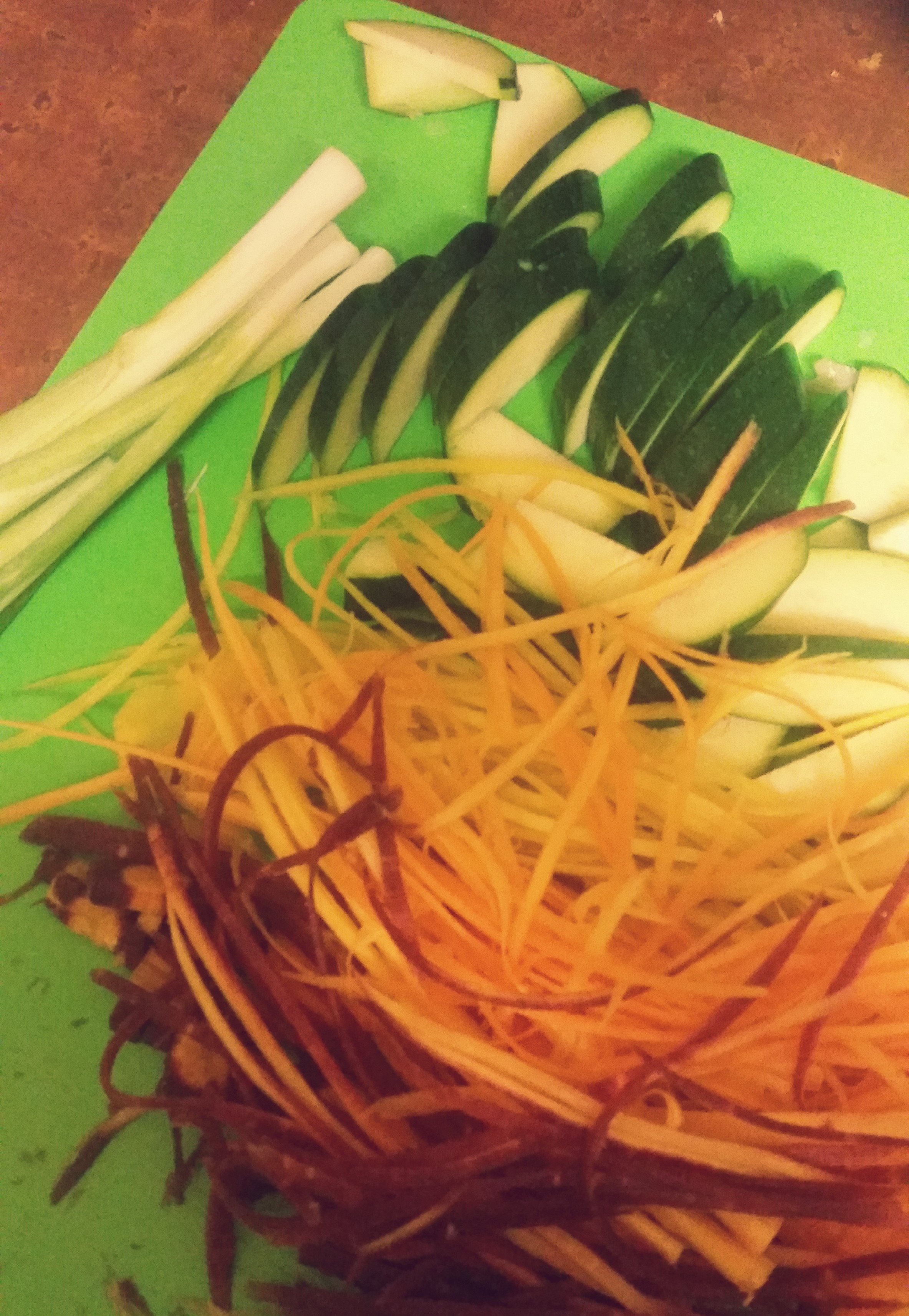 This was mostly an effort to use up items from our awesome CSA box, which just started up for the season, with all the great spring produce. Mid-late June, it’s definitely the season for radishes and spring onions and garlic scapes and things like that, which always sound appealing, but…when we finally shrug and put together a salad, end up seeming like too little or too much (too much, my husband says, in the case of the garlic scapes). This is neither of those, maybe? Simple, but satisfying. Plus, just, what the hell are you supposed to do with Japanese salad turnips? Really?